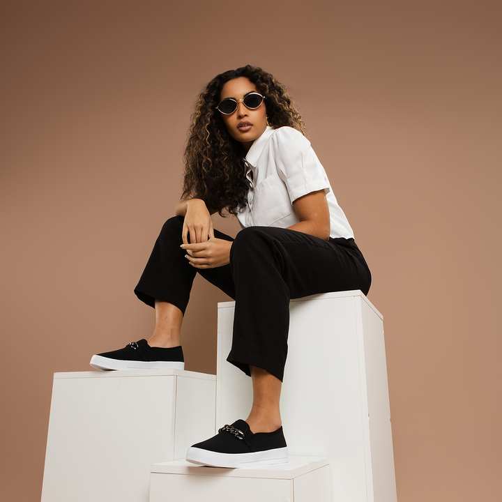 O Slip On Feminino Preto com Corrente é a escolha certa para quem busca um visual prático, elegante e atemporal. Com design minimalista e toque urbano, esse modelo possui material similar ao couro, costura pesponto nas laterais, elástico lateral tonal e um detalhe marcante: corrente metálica moderna, que transforma o tênis em uma peça fashion versátil.
