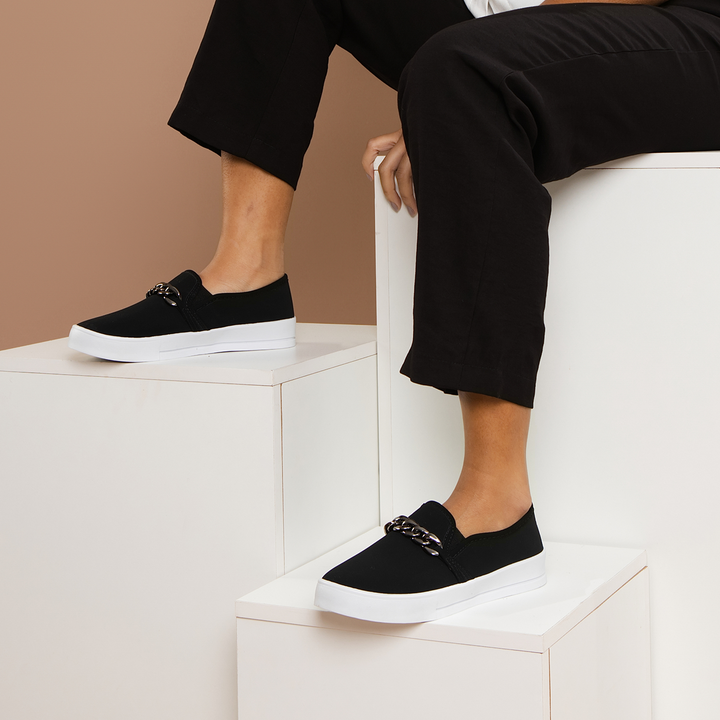 Sapato Feminino Preto Slip On Com Corrente Adicionar à Lista de Desejos